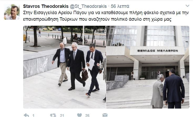 Τη διερεύνηση των καταγγελιών που αφορούν στις άτυπες επαναπροωθήσεις Τούρκων πολιτών που ζητούν άσυλο στην Ελλάδα ζήτησε ο επικεφαλής του Ποταμιού, Σταύρος Θεοδωράκης, από την Εισαγγελέα Αρείου Πάγου, κυρία Ξένη Δημητρίου, με την οποία συναντήθηκε το απόγευμα της Πέμπτης.Εξερχόμενος από την εισαγγελία έκανε την ακόλουθη δήλωση:«Τις τελευταίες μέρες πληθαίνουν οι πληροφορίες αλλά και οι καταγγελίες από Ενώσεις Ανθρωπίνων Δικαιωμάτων για πολίτες της Τουρκίας που προσπαθούν να ζητήσουν άσυλο στη χώρα μας αλλά μυστικά και άτυπα τους επιστρέφουν κάποιοι στα τουρκικά εδάφη. Το αποτέλεσμα είναι κάποιοι απ’ αυτούς να καταλήγουν στις τουρκικές φυλακές. Ετοιμάσαμε ένα μεγάλο φάκελο με τις καταγγελίες και τις δώσαμε στην Εισαγγελέα Αρείου Πάγου, την κυρία Δημητρίου, συζητήσαμε τα στοιχεία, μας διαβεβαίωσε ότι θα δει πολύ προσεκτικά την υπόθεση, η οποία μπορεί να δημιουργήσει πρόβλημα στη χώρα μας και μπορεί να δυσφημίσει την Ελλάδα σε ένα πολύ ευαίσθητο θέμα, όπως είναι το θέμα των ανθρωπίνων δικαιωμάτων. Και μας είπε ότι τις επόμενες ώρες και μέρες θα μελετήσει το φάκελο και θα προχωρήσει στις δικές της ενέργειες».Τον Σταύρο Θεοδωράκη συνόδευαν ο επίτιμος Αντιεισαγγελέας Αρείου Πάγου και ειδικός σύμβουλος του επικεφαλής σε θέματα Δικαιοσύνης Βασίλης Μαρκής, ο πρέσβης ε.τ., σύμβουλος του επικεφαλής σε θέματα Εξωτερικής Πολιτικής, Γιώργος Κακλίκης καθώς και ο εκπρόσωπος Τύπου Δημήτρης Τσιόδρας.