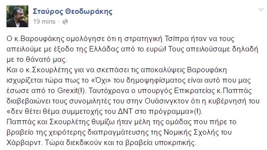 Τη συνέντευξη του Γιάνη Βαρουφάκη και τις δηλώσεις του Πάνου Σκουρλέτη και του Νίκου Παππά σχολίασε ο επικεφαλής του Ποταμιού, Σταύρος Θεοδωράκης, μέσω του προσωπικού του λογαριασμού στο Facebook.