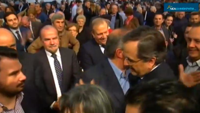 Όταν τον τελείωσε την ομιλία του ο κ. Σαμαράς, κατευθύνθηκε προς το μέρος του, αγκαλιάζοντας τον πρώην Πρωθυπουργό.