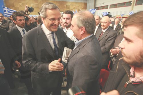 Θερμό χαιρετισμό με τον Κώστα Καραμανλή είχε ο Πρωθυπουργός Αντώνης Σαμαράς πριν από την ομιλία του στη Θεσσαλονίκη, στο Βελλίδειο συνεδριακό κέντρο.
