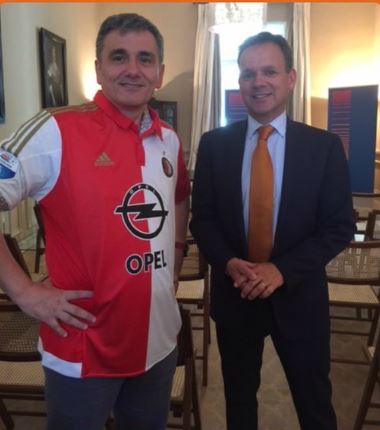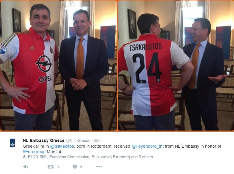 «Ο Έλληνας υπουργός Οικονομικών, Ευκλείδης Τσακαλώτος, ο οποίος γεννήθηκε στο Ρότερνταμ, έλαβε την φανέλα της Φέγενορντ από την ολλανδική πρεσβεία προς τιμήν του Eurogroup της 24ης Μαΐου» αναφέρει σε ανάρτησή της η ολλανδική πρεσβεία στο Twitter.