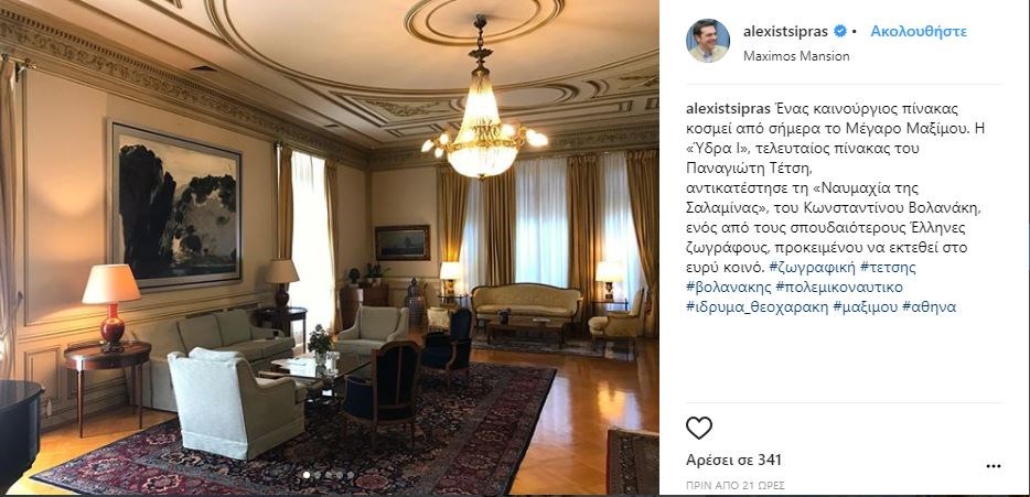 “Ένας καινούργιος πίνακας κοσμεί από σήμερα το Μέγαρο Μαξίμου. Η «Ύδρα Ι», τελευταίος πίνακας του Παναγιώτη Τέτση, αντικατέστησε τη «Ναυμαχία της Σαλαμίνας», του Κωνσταντίνου Βολανάκη, ενός από τους σπουδαιότερους Έλληνες ζωγράφους, προκειμένου να εκτεθεί στο ευρύ κοινό”.