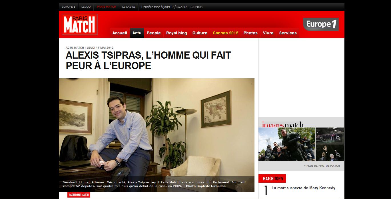 “Ο άνθρωπος που κάνει την Ευρώπη να φοβάται” είναι ο τίτλος του κειμένου για τον Αλέξη Τσίπρα από το γαλλικό περιοδικό Paris Match. Ο συντάκτης-αναλυτής του περιοδικού, αφού κάνει έναν πρόλογο για την άνοδο της Χρυσής Αυγής, εστιάζει στον Αλέξη Τσίπρα “που οδήγησε το κόμμα της ριζοσπαστικής αριστεράς στην εκλογική επιτυχία της δεύτερης θέσης για πρώτη στην ιστορία του”. Τον χαρακτηρίζει “μαχητικό αριστερό” αλλά και “νέο άξονα της ελληνικής πολιτικής σκηνής”. Φιλοξενεί δηλώσεις του Αλέξη Τσίπρα για την κρίση και τις αιχμές του για τις προηγούμενες κυβερνήσεις της Ελλάδας αλλά και τις αποτυχημένες συνταγές που εφαρμόστηκαν στον λαό-πειραματόζωο “στο εργαστήριο της παγκόσμιας οικονομικής κρίσης”.«Γίναμε τα ποντίκια στο εργαστήριο της παγκόσμιας οικονομικής κρίσης» δηλώνει ο Αλέξης Τσίπρας. «Οι μεγάλες δυνάμεις αξιολογούν τα αποτελέσματα της δικής μας εμπειρίας. Αν το «φάρμακο» πιάσει σε μας, τα «ποντίκια», θα καταλήξουν στη συνταγή που πρέπει να εφαρμόσουν και στα άλλα κράτη της Ευρώπης. Αν αποτύχει, τόσο το χειρότερο για τους Ελληνες».Ο δημοσιογράφος του “Paris Match” ρωτάει επίσης τον Αλέξη Τσίπρα αν φοβάται περαιτέρω άνοδο της Χρυσής Αυγής, στις επόμενες εκλογές.« Το εκλογικό αποτέλεσμα των νεοναζί, μας κατέπληξε όλους, όμως δεν είναι παρά η έκφραση της βαθιάς δυσφορίας της ελληνικής κοινωνίας. Ήταν μια ψήφος αντι-πολιτική. Πολύς κόσμος δεν κατάλαβε ποιός κρυβόταν πίσω από αυτά τα λαϊκίστικα συνθήματα. Τώρα που οι ψηφοφόροι ανακάλυψαν ποιοί είναι αυτοί οι άνθρωποι, νομίζω πως δεν θα τους βοηθήσουν να εκλεγούν» Στο δημοσίευμα, το περιοδικό, χρησιμοποιεί μια φωτογραφία του Αλέξη Τσίπρα που ποζάρει στο γραφείο του στο Κοινοβούλιο