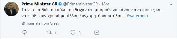 Τα συγχαρητήρια του στην Εθνική Ομάδα Νέων του πόλο για την κατάκτηση του χρυσού μεταλλίου στο Παγκόσμιο Πρωτάθλημα έδωσε ο Πρωθυπουργός Αλέξης Τσίπρας, με ανάρτηση του στο twitter.