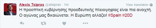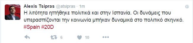 «Η λιτότητα ηττήθηκε πολιτικά και στην Ισπανία. Οι δυνάμεις που υπερασπίζονται την κοινωνία μπήκαν δυναμικά στο πολιτικό σκηνικό» έγραψε στο λογαριασμό του στο twitter.