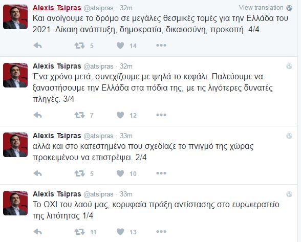 «Το ΟΧΙ του λαού μας, κορυφαία πράξη αντίστασης στο ευρωιερατείο της λιτότητας, αλλά και στο κατεστημένο που σχεδίαζε το πνιγμό της χώρας προκειμένου να επιστρέψει», σημειώνει ο Αλέξης Τσίπρας μέσω Twitter, με αφορμή τη συμπλήρωση ενός έτους από τη διενέργεια του δημοψηφίσματος της 5ης Ιουλίου.