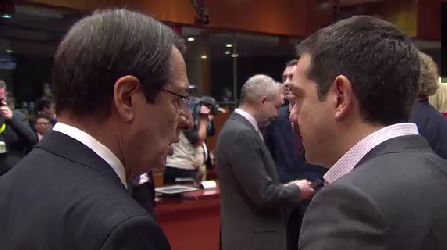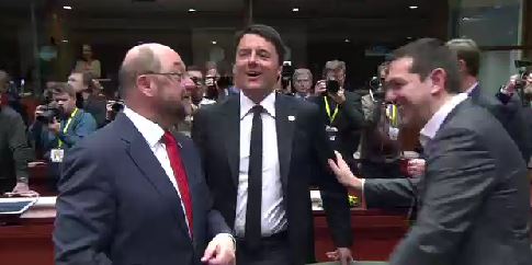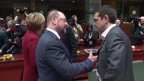 Σε ιδιαίτερα φιλικό κλίμα ήταν ήταν η σύντομη συζήτηση που είχε ο Έλληνας Πρωθυπουργός με τον Πρόεδρο του Ευρωπαϊκού Κοινοβουλίου με τον Μάρτιν Σουλτς να τον χτυπάει γελώντας στον ώμο και την Άγκελα Μέρκελ να στέκεται δίπλα μιλώντας με τον Ιταλό Πρωθυπουργό.