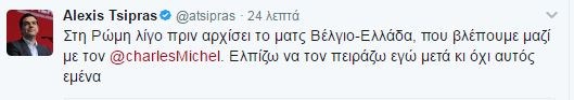 Τον ποδοσφαιρικό αγώνα Βελγίου – Ελλάδας για τα προκριματικά του Μουντιάλ παρακολουθούν από τη Ρώμη ο Αλέξης Τσίπρας με τον Βέλγο ομόλογο του, Σαρλ Μισέλ.”Στη Ρώμη λίγο πριν αρχίσει το ματς Βέλγιο-Ελλάδα, που βλέπουμε μαζί με τον Σαρλ Μισέλ. Ελπίζω να τον πειράζω εγώ μετά κι όχι αυτός εμένα”, αναφέρει σε ανάρτηση του στο Twitter ο Έλληνας Πρωθυπουργός ανεβάζοντας και μια φωτογραφία μαζί με τον Πρωθυπουργό του Βελγίου.