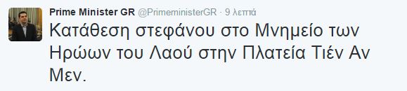 «Κατάθεση στεφάνου στο Μνημείο των Ηρώων του Λαού στην Πλατεία Τιέν Αν Μεν», έγραψε στο Twitter ο Πρωθυπουργός, και ανέβασε δύο φωτογραφίες από τη στιγμή της κατάθεσης στεφάνου.