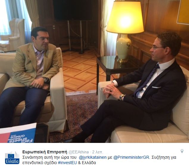 Η Αντιπροσωπεία της Ευρωπαϊκής Επιτροπής στην Ελλάδα ανέβασε στον επίσημο λογαριασμό της στο Twitter την φωτογραφία από τη συνάντηση που βρίσκεται σε εξέλιξη αναφέροντας: «Συζήτηση για επενδυτικό σχέδιο».