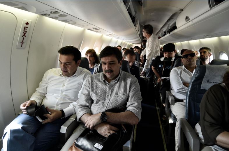 Ο Πρωθυπουργός, Αλέξης Τσίπρας και ο υπουργός Υγείας Ανδρέας Ξανθός συνομιλούν στο αεροπλάνο κατά την διάρκεια της πτήσης προς την Σαντορίνη.