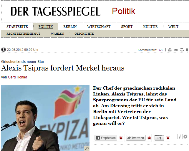 H εφημερίδα, με αφορμή την επίσκεψη του Αλέξη Τσίπρα στο Βερολίνο σημειώνει:«Ο Τσίπρας ποντάρει ψηλά. Ο λαϊκιστής εξυπηρετεί τους πάντες. Ο Τσίπρας γοητεύει τους αριστερούς με επαναστατική φρασεολογία και το κέντρο με δηλώσεις του τύπου ‘θα κάνουμε τα πάντα για μείνουμε στην Ευρωζώνη’. Οι εφτά από τις δώδεκα συνιστώσες του ΣΥΡΙΖΑ όμως επιθυμούν έξοδο από το ευρώ».               «Ένας λόγος που επισκέφθηκε ο ‘νέος σταρ της πολιτικής’ το Βερολίνο, ήταν και για ‘μαζέψει’ την εικόνα του, αυτή του λαϊκιστή. Με φράσεις όπως ‘δεν επιθυμούμε να διαταράξουμε εμείς την ηρεμία της Ευρώπης’ ή ‘εσείς οι Γερμανοί είστε τα μεγαλύτερα αδέρφια μας’, προσπαθεί να πείσει τους Γερμανούς να πάνε διακοπές στην Ελλάδα» αναφέρει η εφημερίδα.