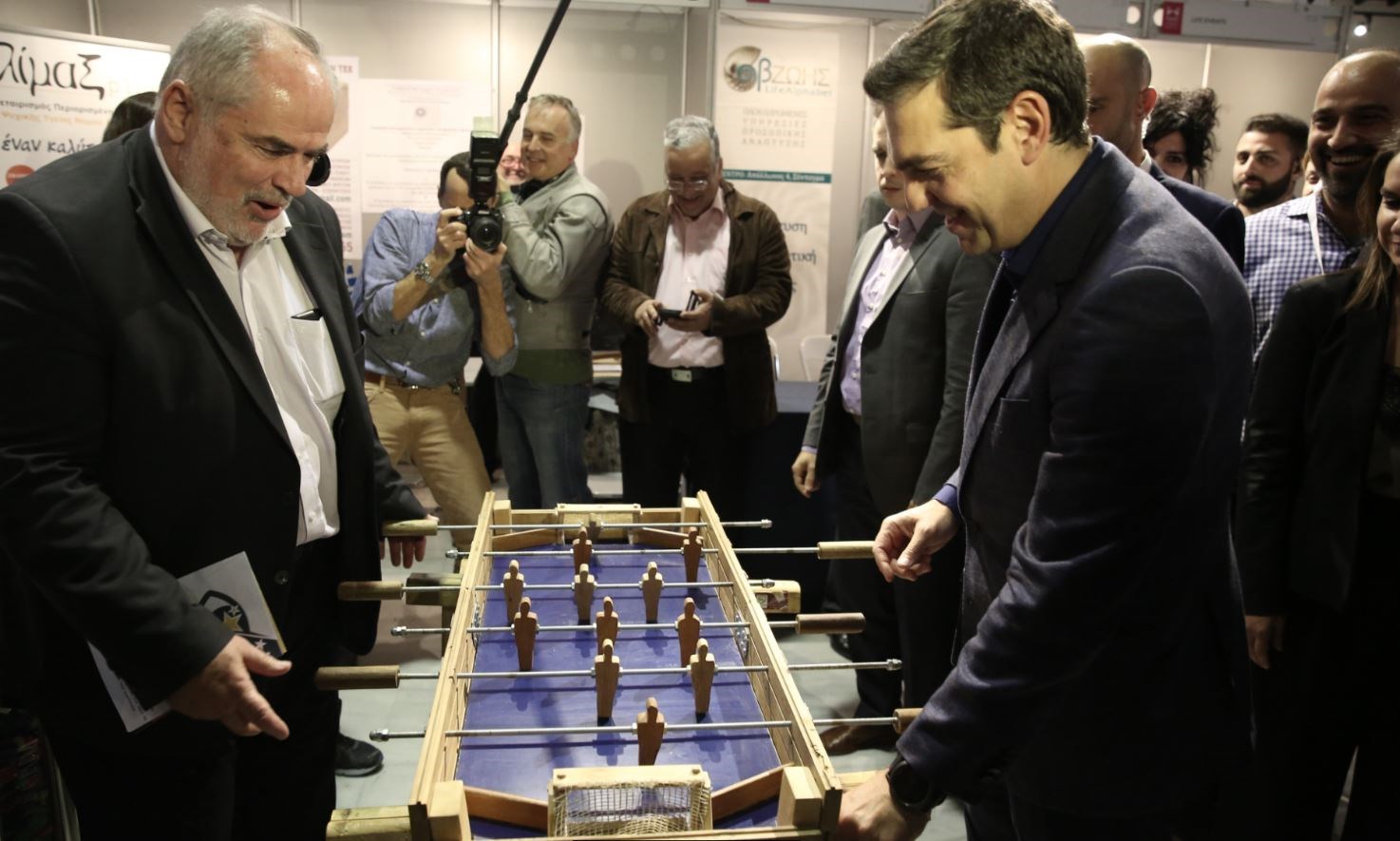 Ο πρωθυπουργός ξεναγήθηκε στην έκθεση, όπου έπαιξε ξύλινο ποδοσφαιράκι, δοκίμασε ρακομέλο και διάφορα προϊόντα.