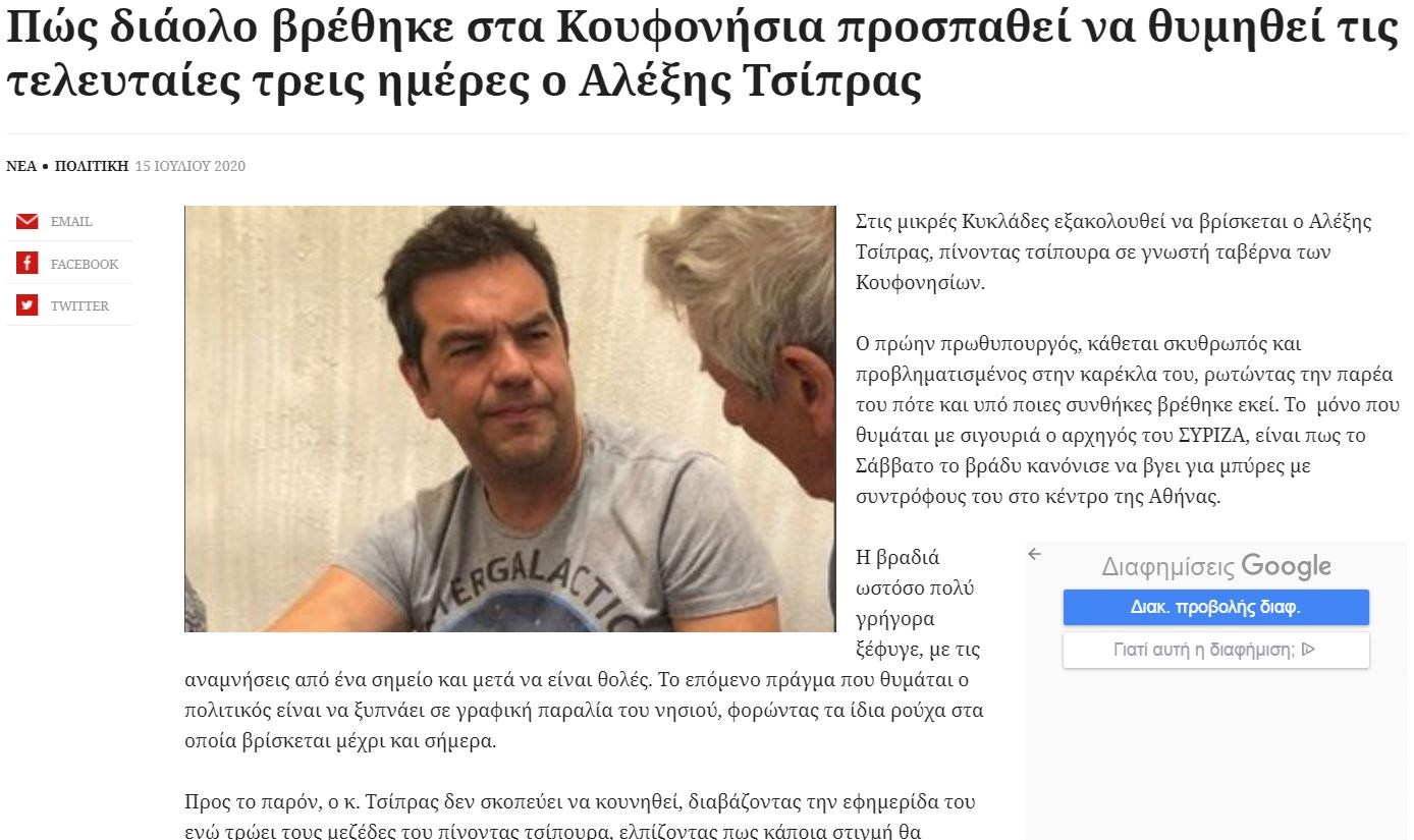 «Στις μικρές Κυκλάδες εξακολουθεί να βρίσκεται ο Αλέξης Τσίπρας, πίνοντας τσίπουρα σε γνωστή ταβέρνα των Κουφονησίων. Ο πρώην πρωθυπουργός, κάθεται σκυθρωπός και προβληματισμένος στην καρέκλα του, ρωτώντας την παρέα του πότε και υπό ποιες συνθήκες βρέθηκε εκεί», έγραφε το Κουλούρι στην «είδηση» με τίτλο «Πώς διάολο βρέθηκε στα Κουφονήσια προσπαθεί να θυμηθεί τις τελευταίες τρεις ημέρες ο Αλέξης Τσίπρας».