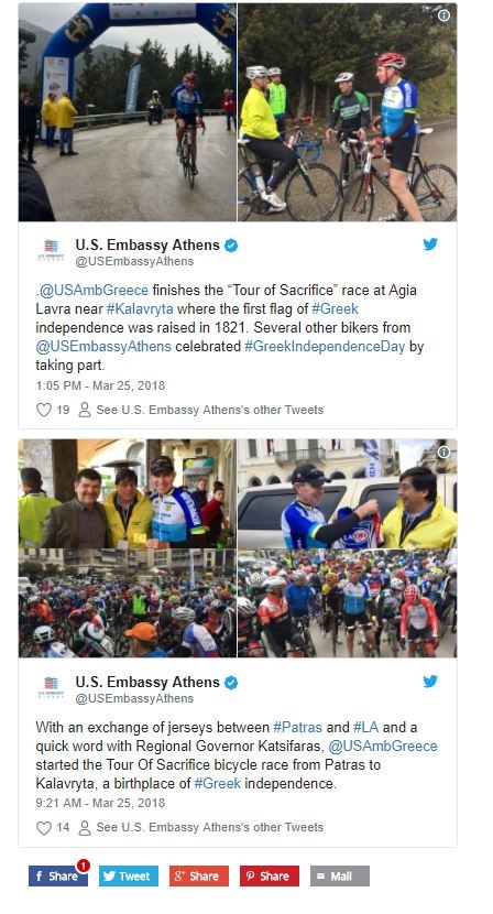 Ο Τζέφρι Πάιατ, άφησε για λίγο στην άκρη τα καθήκοντά του και βρέθηκε στην Πάτρα, όπου έλαβε μέρος σε αγώνα ποδηλασίας με αφετηρία, την πλατεία Γεωργίου στην Πάτρα και τερματισμό στην Ι.Μ. Αγίας Λαύρας Ηρώων.