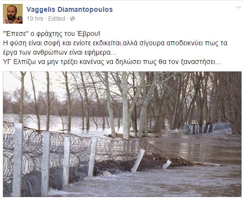 Την πτώση του φράχτη του Έβρου από την κακοκαιρία σχολίασε ο βουλευτής του ΣΥΡΙΖΑ, Βαγγέλης Διαμαντόπουλος, κάνοντας λόγο για “σοφία της φύσης”.