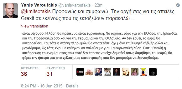“Προφανώς και συμφωνώ. Την οργή σας για τις απειλές Grexit σε εκείνους που τις εκτοξεύουν παρακαλώ…” έγραψε ο κ.Βαρουφάκης στο λογαριασμό του στο Τwitter.