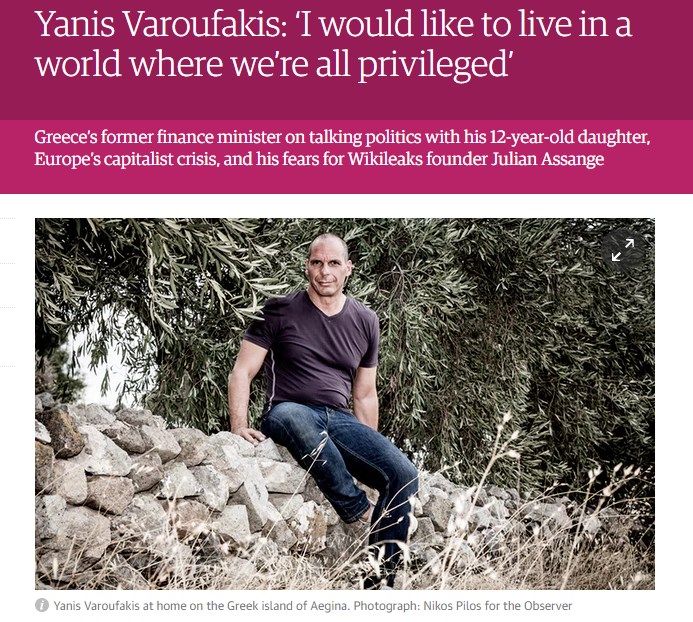 Συνέντευξη στη βρετανική εφημερίδα «The Guardian» παραχώρησε ο πρώην υπουργός Οικονομικών, Γιάνης Βαρουφάκης. Στο πλαίσιο της συνέντευξης που έχει ως γενικό τίτλο τη δήλωση του Βαρουφάκη «Θα ήθελα να ζω σε έναν κόσμο όπου θα ήμασταν όλοι προνομιούχοι», ο κ. Βαρουφάκης ρωτήθηκε, μεταξύ άλλων, και για το αν διατηρεί ακόμα σχέσεις με τον Έλληνα Πρωθυπουργό και πρώην φίλο του, Αλέξη Τσίπρα.