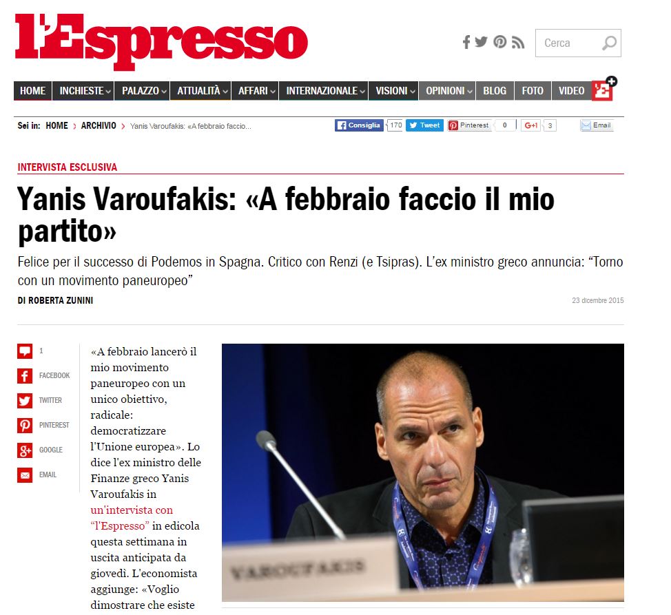 «Τον Φεβρουάριο θα κάνω το δικό μου κόμμα» αποκάλυψε ο Γιάνης Βαρουφάκης σε συνέντευξή του στην ιταλική ιστοσελίδα espresso.repubblica.it. Ο πρώην υπουργός Οικονομικών έκανε λόγο για μία πανευρωπαϊκή κίνηση με στόχο τον εκδημοκρατισμό της Ευρωπαϊκής Ένωσης.