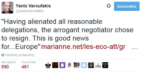 «Έχοντας αποξενώσει όλες τις λογικές αντιπροσωπείες, ο υπερόπτης διαπραγματευτής αποφάσισε να παραιτηθεί. Αυτά είναι καλά νέα για την… Ευρώπη», γράφει στο tweet o βουλευτης του ΣΥΡΙΖΑ και πρώην υπουργός Οικονομικών Γιάνης Βαρουφάκης.