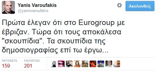 «Πρώτα έλεγαν ότι στο Eurogroup με έβριζαν. Τώρα ότι τους αποκάλεσα “σκουπίδια”. Τα σκουπίδια της δημοσιογραφίας επί τω έργω…», γράφει στο tweet o Γιάνης Βαρουφάκης.
