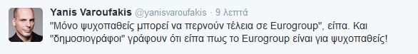 Ο ίδιος έγραψε σ��ο Twitter: «Μόνο ψυχοπαθείς μπορεί να περνούν τέλεια σε Eurogroup», είπα. Και «δημοσιογράφοι» γράφουν ότι είπα πως το Eurogroup είναι για ψυχοπαθείς!