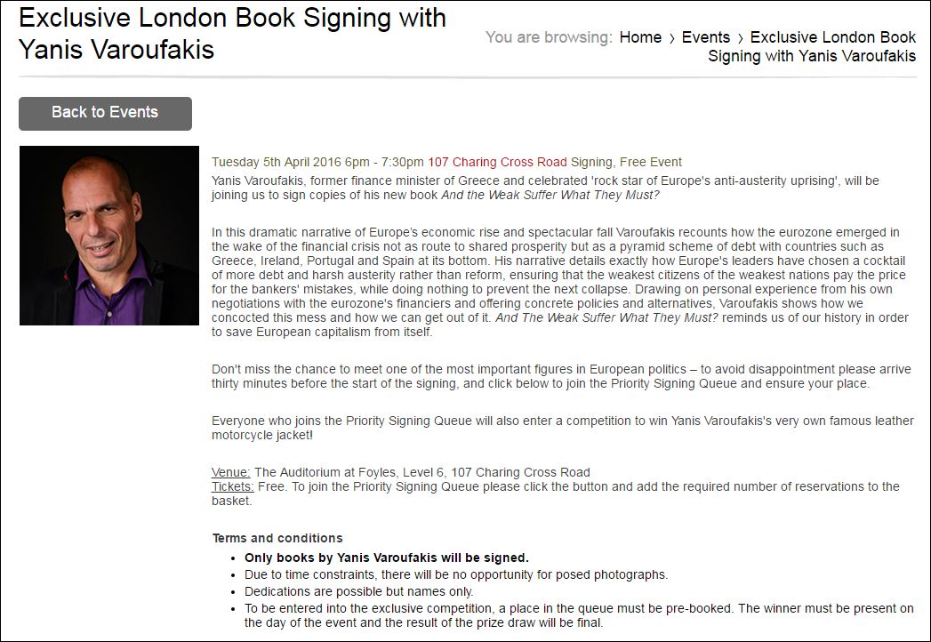 Στην ανακοίνωση της εκδήλωσης στην ιστοσελίδα του Οίκου, αναφέρεται, μεταξύ άλλων, πως ο Γιάνης Βαρουφάκης, όχι μόνο θα υπογράψει το βιβλίο του στους συμμετέχοντες, αλλά θα δώσει την ευκαιρία σε έναν τυχερό να φύγει φορώντας το δερμάτινο μπουφάν του.