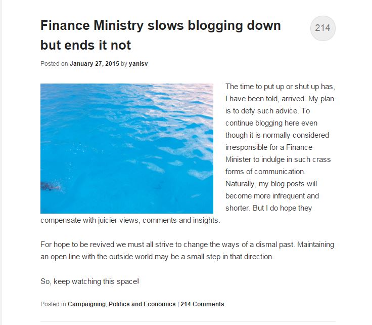 Την πρόθεσή του να διατηρήσει την επαφή του με τους αναγνώστες του ιστολογίου του, σημειώνει ο νέος υπουργός Οικονομικών Γιάνης Βαρουφάκης.