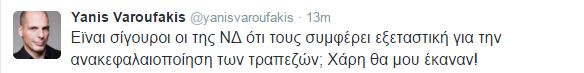 Μέσω του λογαρισμού του στο twitter o πρώην υπουργός Οικονομικών Γιάνης Βαρουφάκης σχολιάζει την πρόθεση της ΝΔ για διεξαγωγή εξεταστικής επιτροπής για την ανακεφαλαιοποίηση των τραπεζών.