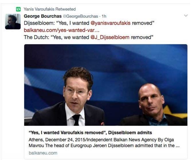 Είναι γεγονός πως οι σχέσεις του Γιάνη Βαρουφάκη με τον Γερούν Ντάισελμπλουμ, δεν είναι οι καλύτερες.Ο πρόεδρος μάλιστα του Eurogroup, είχε ζητήσει ανοιχτά στο παρελθόν την αποχώρησή του Έλληνα πρώην υπουργού Οικονομικών από την διαπραγματευτική ομάδα.Τώρα, o Γιάννης Βαρουφάκης «πανηγυρίζει» μέσω twitter για την εκλογική ήττα του Γερούν Ντάισελμπλουμ στην Ολλανδία.Συγκεκριμένα, ο πρώην υπουργός Οικονομικών, έκανε retweet το παρακάτω σχόλιο ενός χρήστη του twitter, που γράφει: «Ντάισελμπλουμ: «Ναι, ήθελα να φύγει ο Γιάνης Βαρουφάκης» «Ολλανδοί: Ναι, θέλαμε να φύγει ο Γερούν Ντάισελμπλουμ»Δείτε την ανάρτηση: