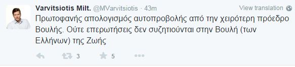 Τη συνέντευξη Τύπου που παραχωρεί αυτή την ώρα η Πρόεδρος της Βουλής, Ζωή Κωνσταντοπούλου, σχολίασε με ανάρτηση του στο Twitter, ο Μιλτιάδης Βαρβιτσιώτης. Συγκεκριμένα, έγραψε: «Πρωτοφανής απολογισμός αυτοπροβολής από την χειρότερη Πρόεδρο της Βουλής. Ούτε επερωτήσεις δεν συζητιούνται στην Βουλή (των Ελλήνων) της Ζωής».