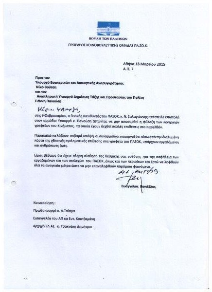 «Στις 9 Φεβρουαρίου, ο Γενικός Διευθυντής του ΠΑΣΟΚ, κ. Ν. Σαλαγιάννης απέστειλε επιστολή στον αρμόδιο Υπουργό κ. Πανούση ζητώντας να μην αποσυρθεί η φύλαξη των κεντρικών γραφείων του Κινήματος, τα οποία έχουν δεχθεί πολλές επιθέσεις στο παρελθόν.
