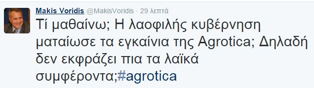 «Τί μαθαίνω; Η λαοφιλής κυβέρνηση ματαίωσε τα εγκαίνια της Agrotica; Δηλαδή δεν εκφράζει πια τα λαϊκά συμφέροντα;».