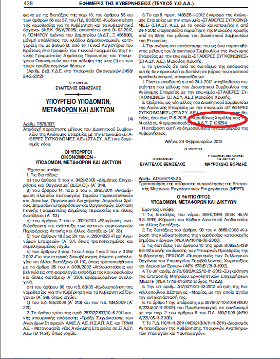 Λίγες ημέρες πριν την υποβολή της παραίτησης του από το ΛΑ.Ο.Σ., κατά τη κατά την συνεδρίαση της Κεντρικής Επιτροπής του κόμματος, ο Μπάμπης Καραθάνος, αναπληρωτής ευρωβουλευτής του κόμματος και Περιφερειακός Σύμβουλος Αττικής, είχε διοριστεί με ΦΕΚ μέλος στο Διοικητικό Συμβούλιο στον οργανισμό ΣΤΑ.ΣΥ. Η ΣΤΑΘΕΡΕΣ ΣΥΓΚΟΙΝΩΝΙΕΣ Α.Ε. που έχει προκύψει από την ενοποίηση της ΑΜΕΛ-ΗΣΑΠ και ΤΡΑΜ Α.Ε. , βρίσκεται υπό την εποπτεία του υπουργείου Υποδομών και Μεταφορών, στο τιμόνι του οποίου βρίσκεται ο πρώην βουλευτής του ΛΑ.Ο.Σ. Μάκης Βορίδης που μετά τη διαγραφή του προσχώρησε στη ΝΔ. Λέτε να έγινε “ανταλαγή”, όταν μάλιστα υπήρχει φημολογία για επιστροφή του κ. Καραθάνου στη ΝΔ; Δείτε το ΦΕΚ που συνυπογράφεται στις 24 Φεβρουαρίου από τον υπουργό Υποδομών Μάκη Βορίδη και τον υπουργό Οικονομικών Ευάγγελο Βενιζέλο.