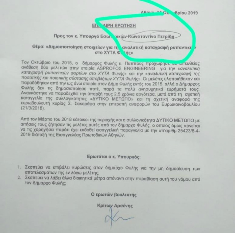 Μεταξύ άλλων, στην ερώτησή του ο Κρίτων Αρσένης αναφέρει ότι το 2015 ο δήμαρχος Φυλής, κ. Παππούς, προχώρησε σε απευθείας ανάθεση δύο μελετών στην εταιρεία «ASPROFOS ENGINEERING» για την αναλυτική καταγραφή ρυπαντικών φορτίων στον ΧΥΤΑ Φυλής και την αναλυτική καταγραφή της ποσοτικής και ποιοτικής σύστασης αποβλήτων ΧΥΤΑ Φυλής.