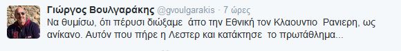 Στο σχόλιό του στο Twitter, ο Γιώργος Βουλγαράκης έγραψε: «Να θυμίσω, ότι πέρυσι διώξαμε από την Εθνική τον Κλαούντιο Ρανιέρι, ως ανίκανο. Αυτόν που πήρε η Λέστερ και κατάκτησε το πρωτάθλημα…»