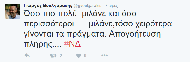 Συγκεκριμένα, ο κ. Βουλγαράκης, έγραψε: «Όσο πιο πολύ μιλάνε και όσο περισσότεροι μιλάνε, τόσο χειρότερα γίνονται τα πράγματα. Απογοήτευση πλήρης….».