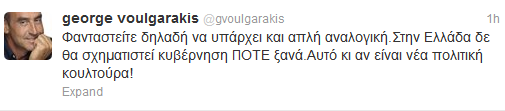“Φανταστείτε δηλαδή να υπάρχει και απλή αναλογική.Στην Ελλάδα δε θα σχηματιστεί κυβέρνηση ποτέ ξανά.Αυτό κι αν είναι νέα πολιτική κουλτούρα!”, έγραψε πριν από λίγο στο Twitter ο πρώην υπουργός της ΝΔ Γιώργος Βουλγαράκης, σχολιάζοντας τις πολιτικές εξελίξεις και τον εκλογικό νόμο.