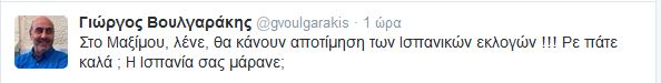 Με ανάρτησή του στον προσωπικό του λογαριασμό στο Twitter, ο Γιώργος Βουλγαράκης, αναφερόμενος στα αποτελέσματα των ισπανικών εκλογών και την αποτίμηση τους από το Μέγαρο Μαξίμου, όπως χαρακτηριστικά ανέφερε, έγραψε: