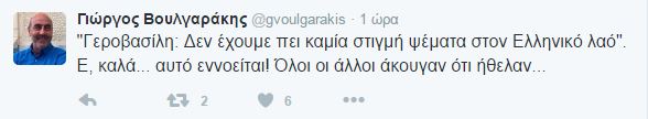 Επίθεση στην κυβερνητική Εκπρόσωπο Όλγα Γεροβασίλη, εξαπέλυσε ο Γιώργος Βουλγαράκης, με ανάρτηση στον προσωπικό του λογαριασμό στο Twitter.