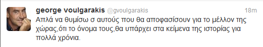 Την ώρα που διεξάγεται στη Βουλή η συζήτηση για το Μνημόνιο ο πρώην βουλευτής της Ν.Δ., Γιώργος Βουλγαράκης twittάρει απευθυνόμενος στην Ολομέλεια τα εξής: “Απλά να θυμίσω σ’ αυτούς που θα αποφασίσουν για το μέλλον της χώρας, ότι το όνομά τους, θα υπάρχει στα κείμενα της ιστορίας για πολλά χρόνια.”