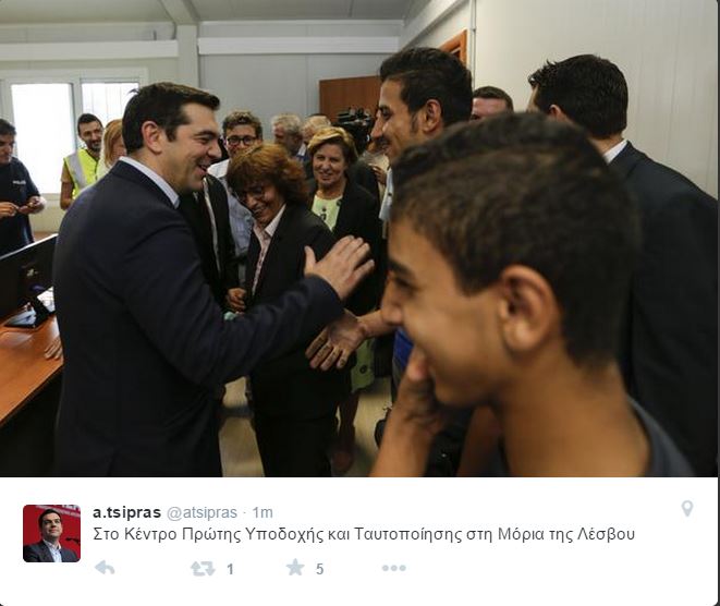 Όπως φαίνεται και στη φωτογραφία που ανέβασε στον προσωπικό του λογαριασμό στο Twitter, ο Αλέξης Τσίπρας, βρέθηκε στο Κέντρο Πρώτης Υποδοχής και Ταυτοποίησης στη Μόρια της Λέσβου, όπου χαιρέτησε και συνομίλησε με τους πρόσφυγες.