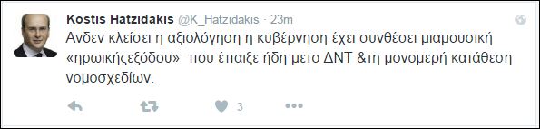 Ο αντιπρόεδρος της ΝΔ, Κωστής Χατζηδάκης, αναφερόμενος στην αξιολόγηση και στο ενδεχόμενο να μην κλείσει έγκαιρα, σχολίασε με δηκτικό τρόπο «τη μονομερή κατάθεση νομοσχεδίων» από την πλευρά της κυβέρνησης, με ένα tweet στον προσωπικό του λογαριασμό: