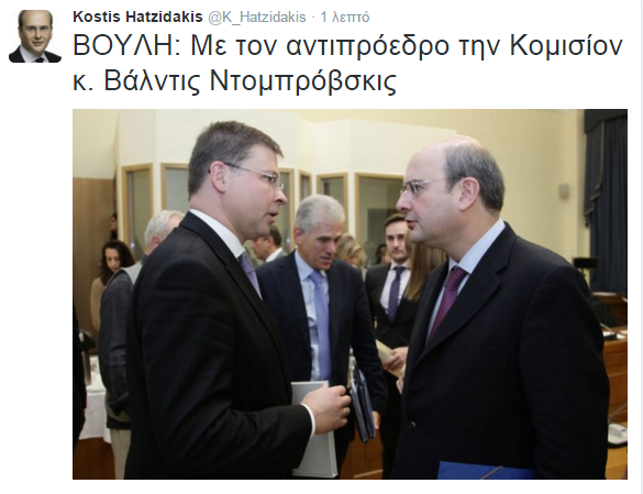 Ο κ. Χατζηδάκης έγραψε: «ΒΟΥΛΗ: Με τον αντιπρόεδρο την Κομισιόν κ. Βάλντις Ντομπρόβσκις».