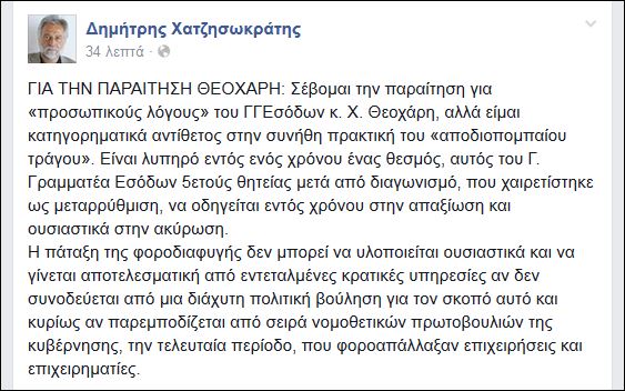 Την παραίτηση του Χάρη Θεοχάρη σχολίασε μέσω Facebook το στέλεχος της Δημοκρατικής Αριστεράς Δημήτρης Χατζησωκράτης.