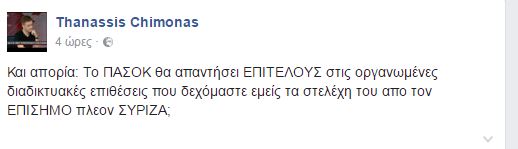 “Και απορία: Το ΠΑΣΟΚ θα απαντήσει ΕΠΙΤΕΛΟΥΣ στις οργανωμένες διαδικτυακές επιθέσεις που δεχόμαστε εμείς τα στελέχη του απο τον ΕΠΙΣΗΜΟ πλεον ΣΥΡΙΖΑ;”
