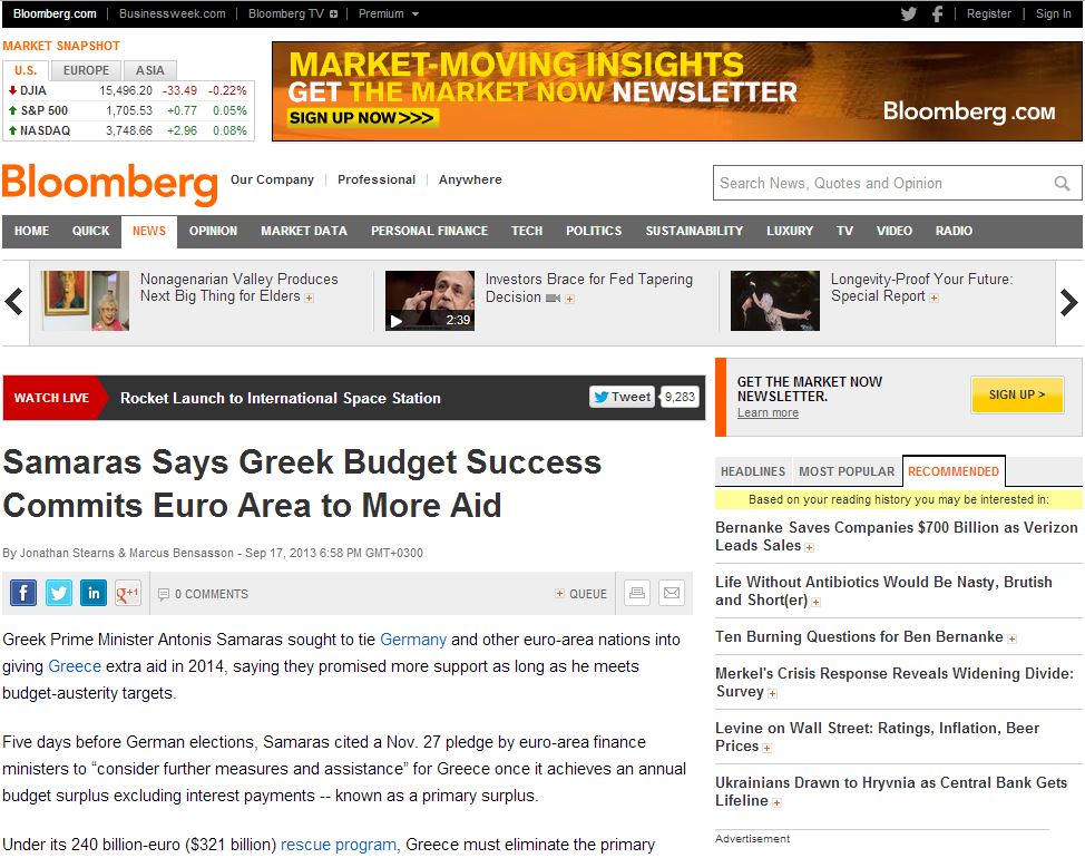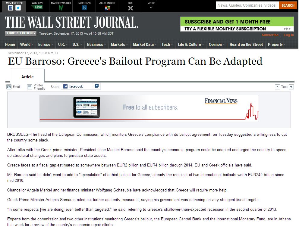 Στη συνέχεια, αναφέρεται ότι ο πρωθυπουργός της Ελλάδας απέρριψε τη λήψη νέων μέτρων λιτότητας, η οποία διανύει τον έκτο χρόνο ύφεσης με την ανεργία να έχει εκτοξευθεί στο 28%. Δεσμεύθηκε επίσης, τονίζεται χαρακτηριστικά, να συνεχίσει τις προσπάθειες απορρύθμισης της ελληνικής οικονομίας και δήλωσε ότι αυτή θα συμβάλει στην ενίσχυση του προϋπολογισμού. «Αυτό που πρέπει να κάνουμε δεν είναι να λάβουμε πρόσθετα μέτρα λιτότητας αλλά να υλοποιήσουμε τις δομικές μεταρρυθμίσεις που επιφέρουν θετικά δημοσιονομικά αποτελέσματα και αυτό έχουμε την πρόθεση να κάνουμε» δήλωσε ο κ. Σαμαράς κατά τη διάρκεια κοινής συνέντευξης με τον πρόεδρο της Ευρωπαϊκής Επιτροπής, Ζοζέ Μπαρόζο, ο οποίος από την πλευρά του εγκωμίασε τα επιτεύγματα της κυβέρνησης συνεργασίας που ηγείται ο κ. Σαμαράς και η οποία κατόρθωσε να βγάλει την Ελλάδα από το περυσινό αδιέξοδο, όπου κυριαρχούσαν οι εκτιμήσεις για έξοδο της Ελλάδας από το ευρώ, όπως υπογραμμίζεται.