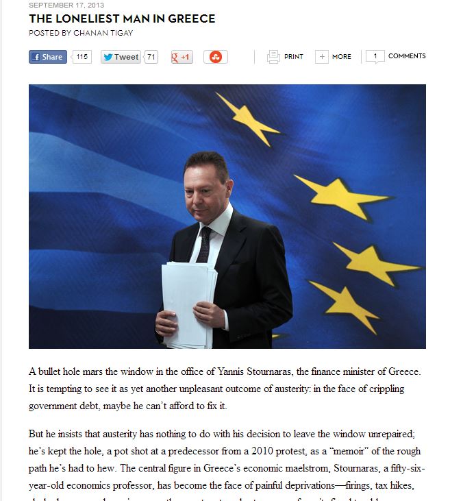 Το αμερικανικό περιοδικό New Yorker δημοσιεύει συνέντευξη- πορτρέτο του υπουργού Οικονομικών, Γιάννη Στουρνάρα, όπου γίνεται αναφορά στο «δύσκολο έργο» που επιτελεί, στις «άριστες σχέσεις» που διατηρεί με τον πρωθυπουργό, Αντώνη Σαμαρά, αλλά και στη «μοναξιά» που βιώνει μέσα στον πολιτικό και κοινωνικό περίγυρο, λόγω των μέτρων λιτότητας. Όπως επισημαίνεται χαρακτηριστικά, ο κ. Στουρνάρας έχει καταστεί η «προσωποποίηση» οδυνηρών μέτρων, όπως οι απολύσεις εργαζομένων, η αύξηση της φορολόγησης και η μείωση μισθών και συντάξεων, στην προσπάθειά του να βγάλει τη χώρα από τα δημοσιονομικά της προβλήματα.