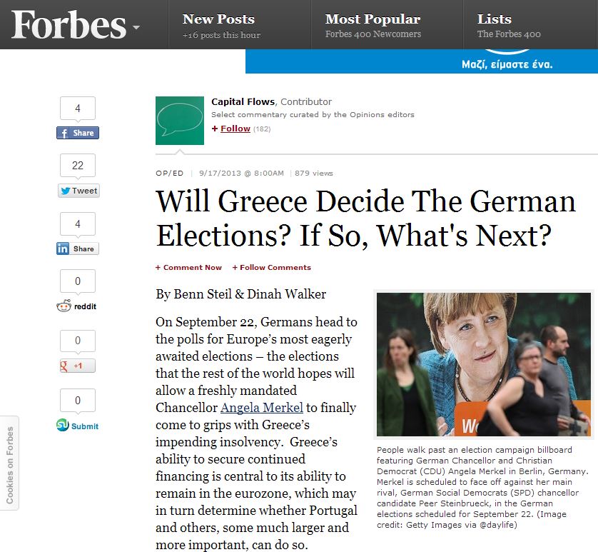 Εκτενές άρθρο για την Ελλάδα, σε σχέση με τις γερμανικές εκλογές, δημοσιεύει το περιοδικό Forbes. Ο διευθυντής διεθνούς οικονομίας στο Συμβούλιο Διεθνών Σχέσεων Benn Steil και η αναλύτρια Dinah Walker εκτιμούν ότι μετά τις γερμανικές εκλογές η κ. Μέρκελ, έχοντας καινούργια εντολή από το εκλογικό σώμα, θα ασχοληθεί με την «αναξιόχρεη Ελλάδα».