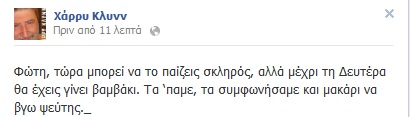 Βέβαιος ότι ο Φώτης Κουβέλης θα συναινέσει στον σχηματισμό κυβέρνησης συνεργασίας είναι ο Χάρυ Κλυνν, όπως προκύπτει και από το αιχμηρό σχόλιο που ανήρτησε πριν από λίγο στο προφίλ του στο Facebook.«Φώτη, τώρα μπορεί να το παίζεις σκληρός, αλλά μέχρι τη Δευτέρα θα έχεις γίνει βαμβάκι. Τα ‘παμε, τα συμφωνήσαμε και μακάρι να βγω ψεύτης», έγραψε ο Χάρυ Κλυνν.